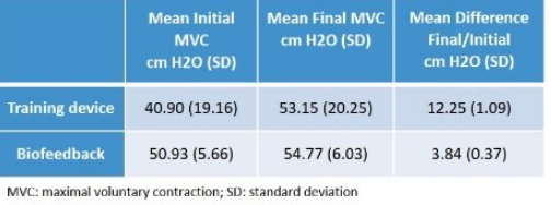This device is: i) Simple, cheap and re-usable device; ii) Physiological strengthening of PFM; iii) User-friendly; iv) Correct contraction performing due to visual cues; v) Correctly placed during exercise execution; vi) Visual training and real-time feedback performance monitoring; vii) Adjustment of external load to achieve different training goals (muscular endurance, muscular strength, muscular power) for training optimization; viii) Usable in clinical environment or at patient’s home; ix) Increase of muscle tonicity, endurance and strength at a short time period; x) Innovative mechanical action of the device for training intensification; xi) Preliminary study with efficient results demonstration prevision.