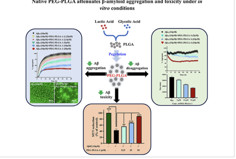 Researchers at the University of Alberta have discovered that PEGylated poly(D,L-lactide-co-glycolide) (PLGA) nanoparticles without conjugation with any additional drug/agent can attenuate amyloid-β (Aβ) aggregation/toxicity in cellular and animal models of AD. Earlier findings demonstrated some therapeutic effects with native PLGA nanoparticles, but the use of native PLGA is limited by rapid clearance by the reticuloendothelial system. Native PEG-PLGA demonstrates enhanced stability, while both inhibiting the formation of Aβ peptide aggregates and promoting the disassembly of existing aggregates. Importantly, PEG-PLGA-1 nanoparticles are non-toxic and markedly improve the viability of mouse primary cortical neurons exposed to Aβ-induced toxicity. These findings highlight the unique neuroprotective effect of native PEG-PLGA-1 nanoparticles and its potential for the treatment of AD pathology. At present, AD is the leading cause of dementia in the elderly population. Current AD drugs are targeted for symptom management and do not halt the underlying neurodegeneration. Treatment strategies in this space also face significant hurdles, such as low blood-brain barrier penetration. The pathological changes that characterize AD suggest that either an overproduction or insufficient clearance of Aβ can elevate its levels, with subsequent aggregation leading to neuronal loss and disease progression. These PEG-PLGA nanoparticles address the underlying pathology and are shown to effectively cross the BBB, offering a promising strategy for AD treatment.