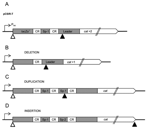 The present invention makes reference to a method for obtaining and detecting spacer insertions in artificial structures (insertion modules) based on Clustered Regularly Interspaced Short Palindromic Repeats (CRISPR) located within a transcriptional unit which includes the sequence of a reporter gene with a displaced reading frame. A new insertion restores the reading frame of the reporter gene, yielding a functional protein (Figure 1). This protein’s activity enables insertion detection and the selection of adapted cells in a way that is independent of the immunization the new spacer could provide. The inserted CRISPR spacer unit encompasses a number of nucleotides that is not multiple of three. The spacer in the insertion module, when it is made up of two CRISPR, contains a cryptic STOP codon that circumvents selection of duplications generated by homologous recombination between repeats (Figure 1). The insertion modules contain a sequence known as leader, which enables the intervention of the acquisition mechanism. The acquisition assays begin with a culture of cells carrying the artificial module in a plasmid. A volume from this culture is spread in a solid culture medium that allows for the selection of the activity provided by the reporter gene. As the tested reporter gene confers resistance to chloranfenicol, the selection is conducted in medium containing this antibiotic. After incubation, grown colonies allegedly contain an insertion. Then, a PCR (Polymerase Chain Reaction) is used to discard false positives and plasmids are purified and sequenced. The analysis of inserted spacers is useful for the study of the acquisition process. The spacers can be used to bestow specific immunity against foreign genetic elements containing a sequence recognizable by the system, i.e. akin to the spacer sequence and adjacent to a 2-3 nucleotides motif (termed PAM) characteristic of the particular system at use. Explanation of Figure 1: Schematic representation of the integration reporter modules cloned in the pCSIR T plasmid and strategy used for specific detection of integration events. (A) The integration cassette in pCSIR-T consists of a leader and two CRISPR duplicons (CR) interspaced by a spacer (Sp-1) fused upstream to a fragment of lacZ-α gene (lacZα’) and, downstream, to the complete coding sequence of an out-of-frame cat gene (cat +2). The translation initiation codon of lacZ-α (white arrowhead) is indicated. Translation of transcripts generated from the lac promoter (Plac, denoted with an arrow) will stop at the leader (black arrowhead). Translation of the transcript generated from Plac will end at the leader in case of deletion (cat would remain out of frame, cat +1) (B), at the duplicated spacer (Sp-1) in case of CRISPR-spacer duplication (C) or at the end of the in frame cat coding sequence in case of new spacer (Sp-2) insertion (D).