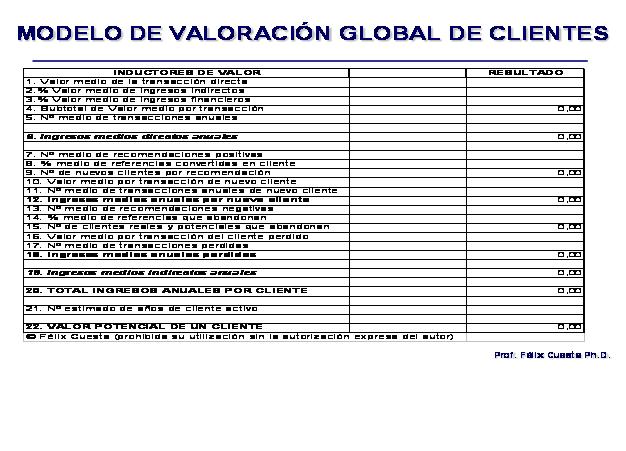 Model of assessment and loyalty methodology of client’s portfolio Clients represent the most important assets of the company of century XXI and for that reason all the companies focuses on announcing their strategy of orientation to the client, but very few are coherent with the messages that are sent to the market. Loyalty must be a constant process whose foundation is the client, whose valuation must be perfectly known by all the organization so that all must be conscious of the importance of obtaining its satisfaction as an objective and getting beyond retention, also its prescription, along its active lifetime. But all marketing processes must count on the enterprise dimension that gives them coherence and support, being originated by an strategic exposition and supported by an organization coherent with this exposition, with the suitable culture oriented to the total satisfaction of the client and facilitated by the information technologies to obtain the maximum effectiveness and yield.
